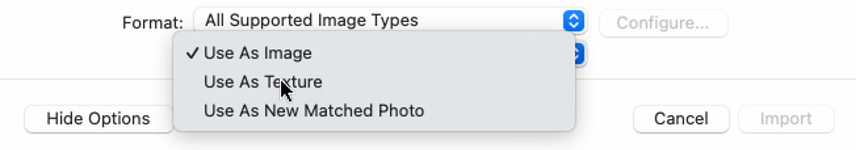 Raster images are images composed of pixels. All raster images can be imported as image objects, textures, or matched photos. In the import window (File > Import), you can choose between these three import types when you select "All Supported Image Types" or one of the supported image formats. You may need to click "Show Options" to see this.