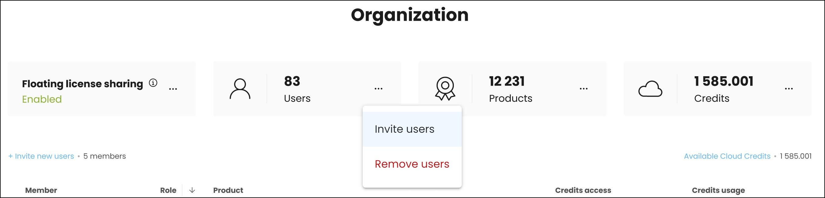 • Om het delen van 'floating' licenties in te schakelen, open je het menu met de drie puntjes naast de optie en klikt u op Enable Floating license sharing (Gedeelde floating licenties inschakelen).