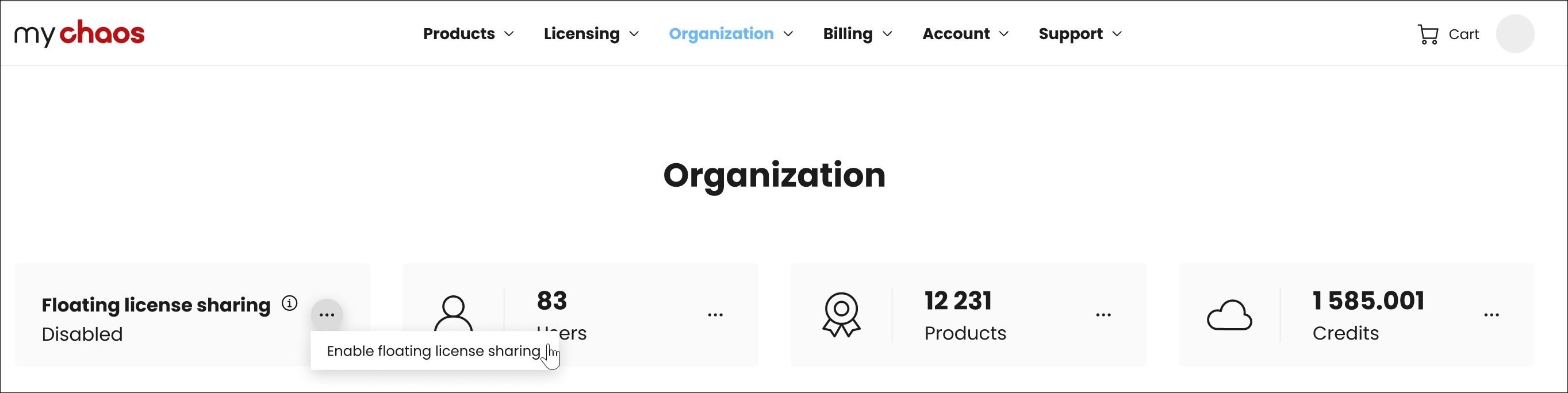 De beheerder (Administrator) kan de 'floating' licenties delen met alle leden (Members) of gasten (Guests) binnen de organisatie. Elke gebruiker die aan de organisatie is toegevoegd, kan de gedeelde licenties gebruiken door het Chaos-product met de standaardinstellingen te installeren en in te loggen op het product met hun eigen Chaos-account.
