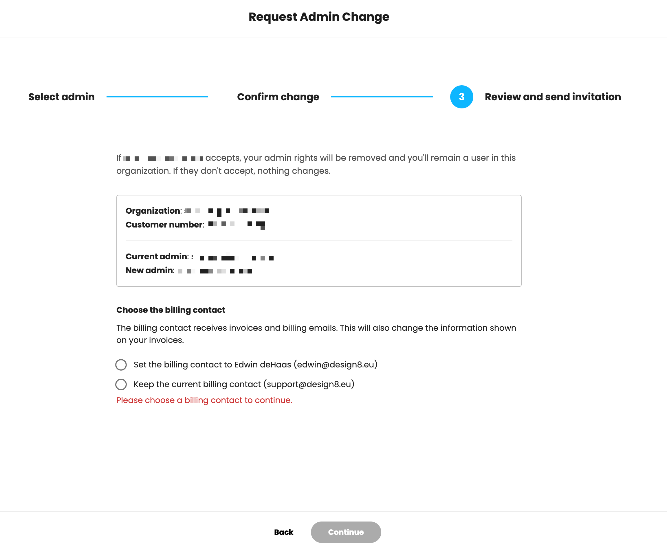 - Voer het e-mailadres van de nieuwe beheerder opnieuw in om te bevestigen en klik op Doorgaan.